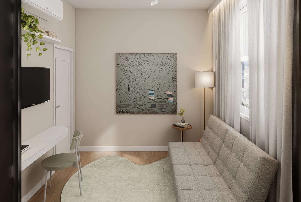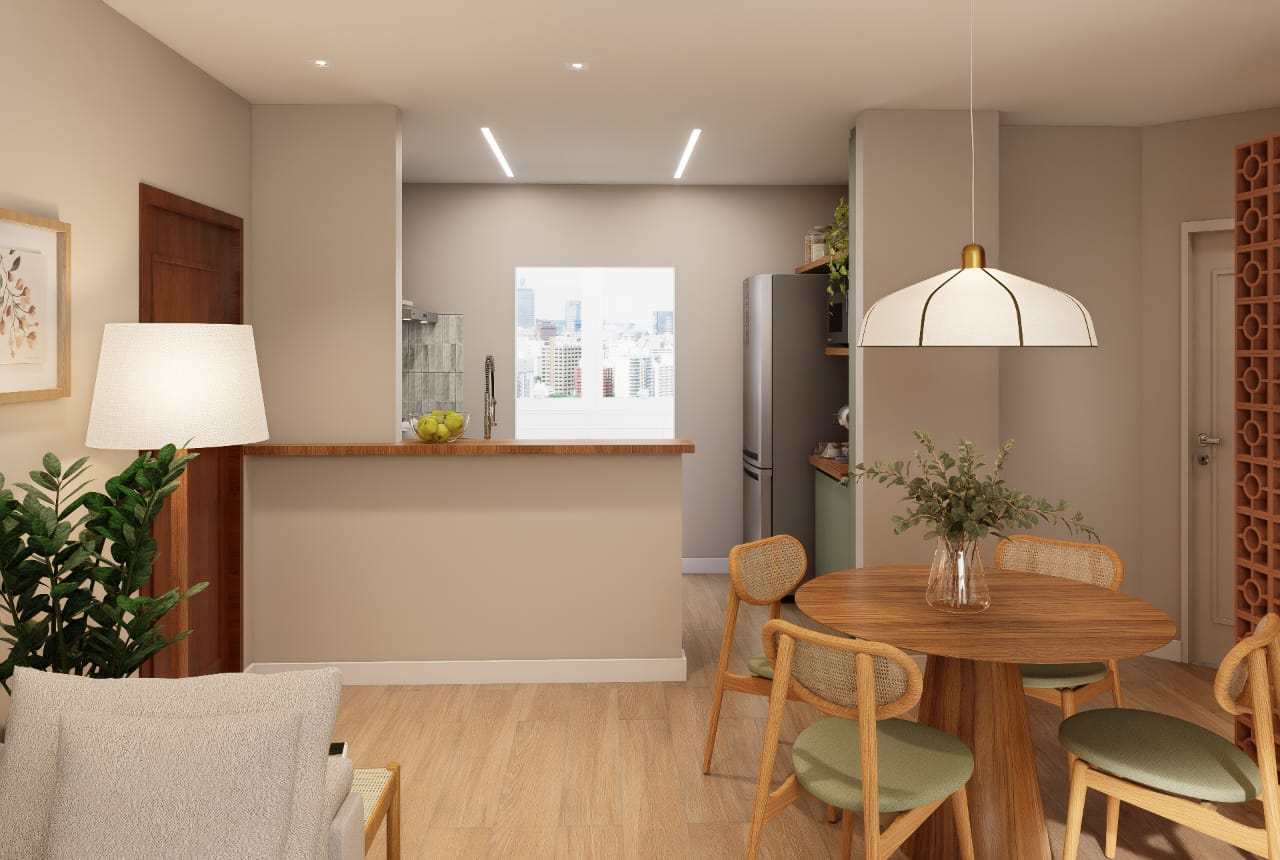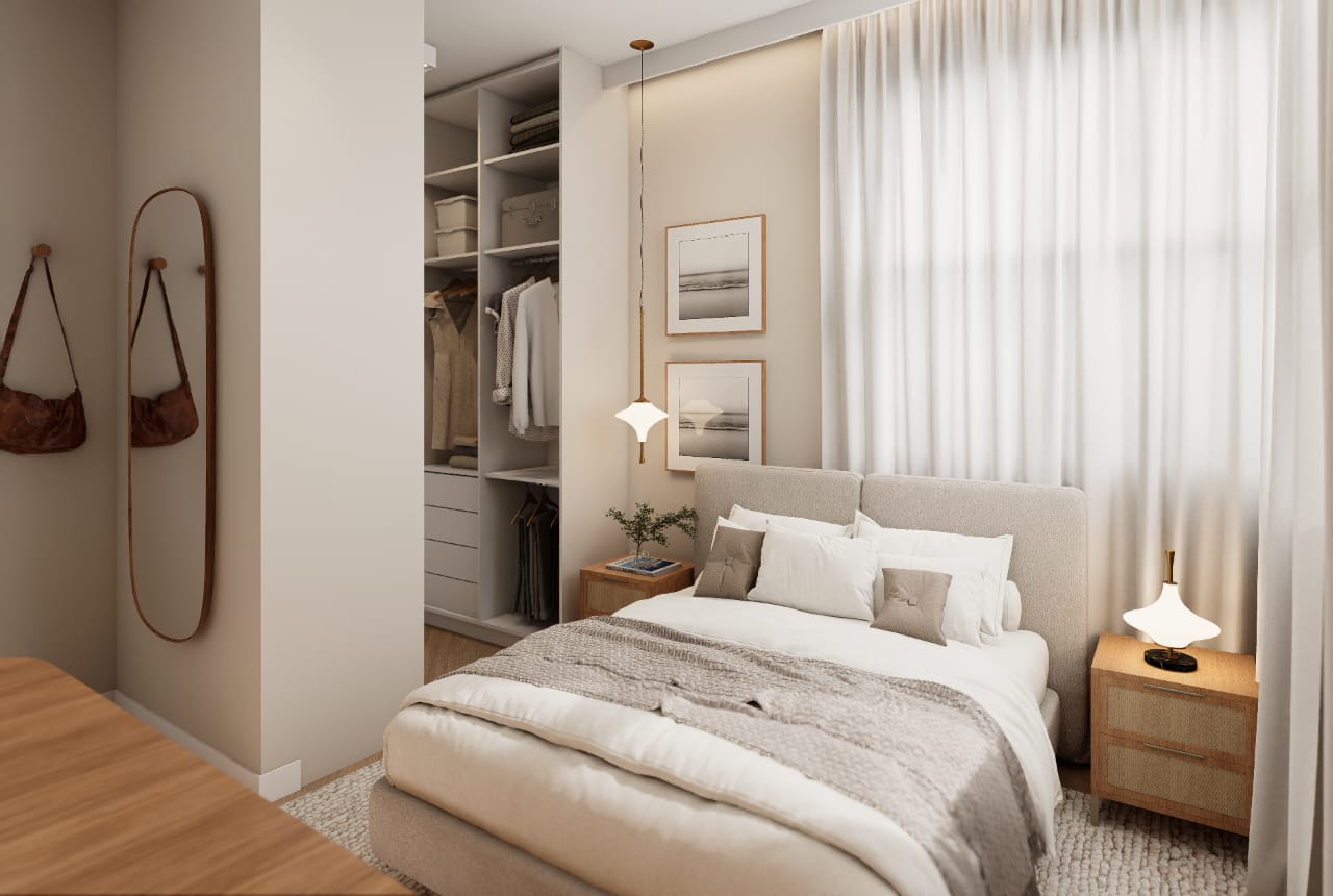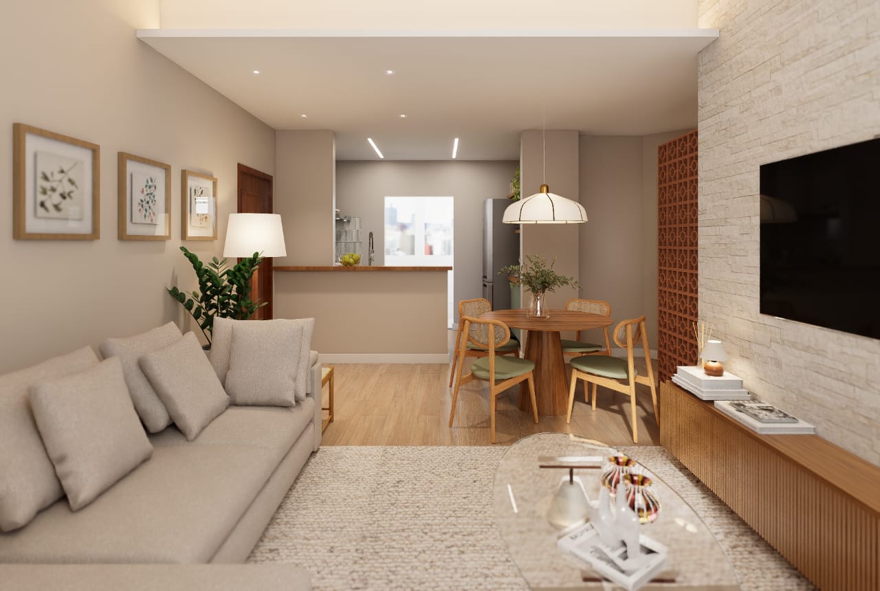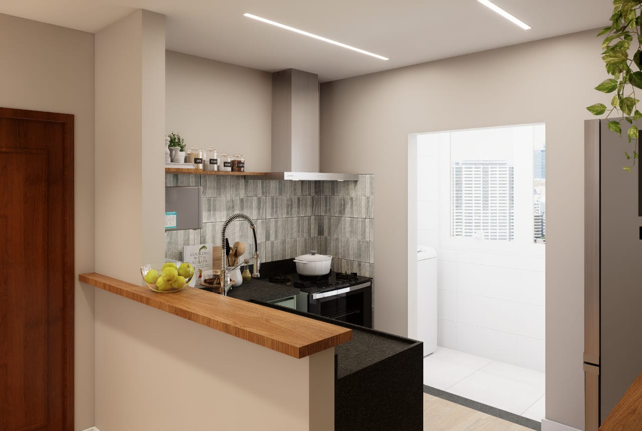 ✨ 2 quartos, sendo um deles suíte + banheiro social + banheiro de serviço + área de serviço