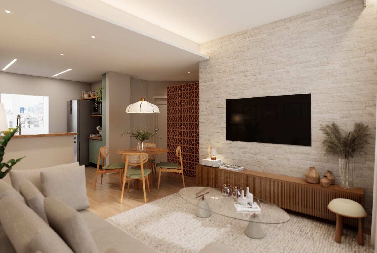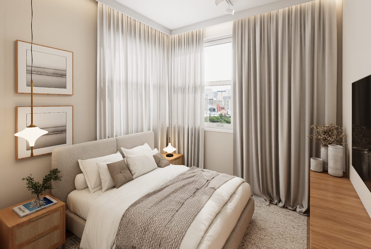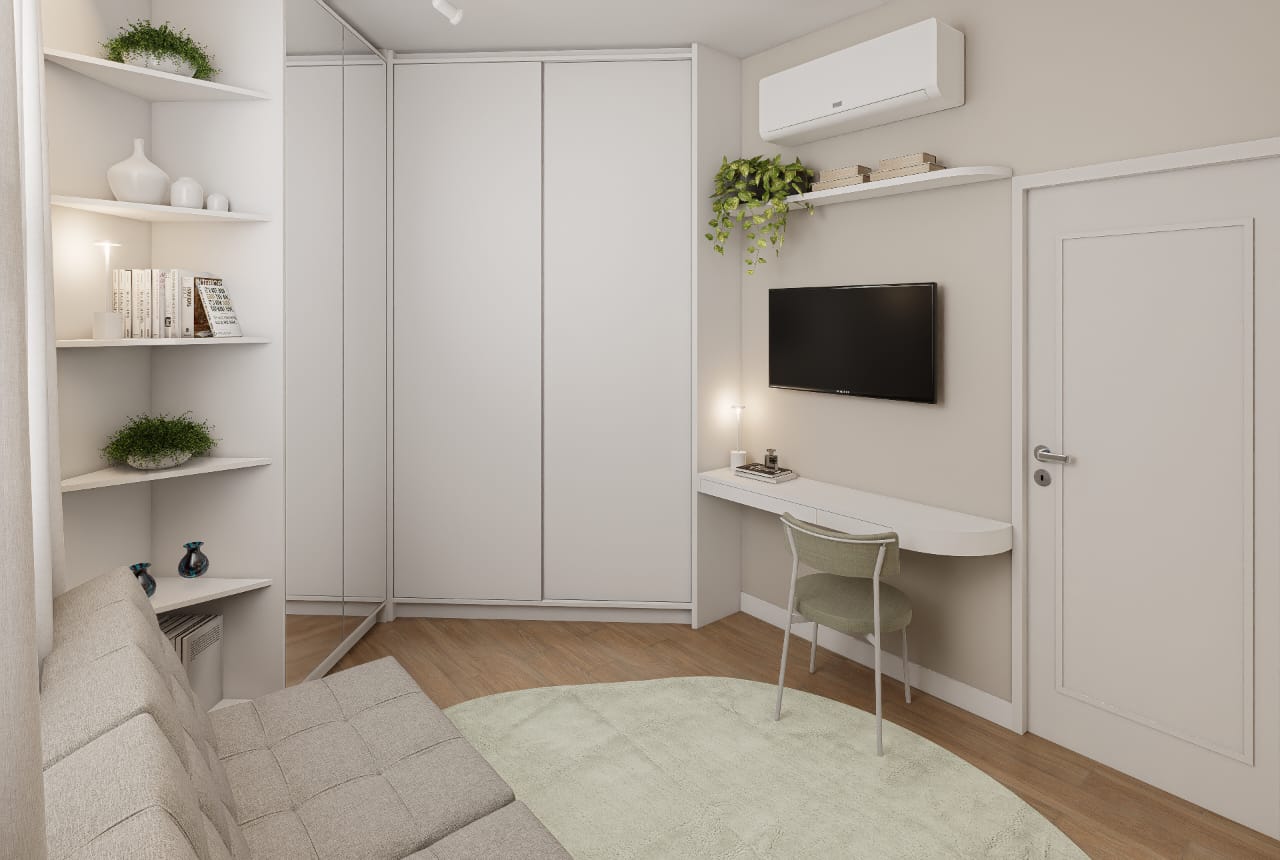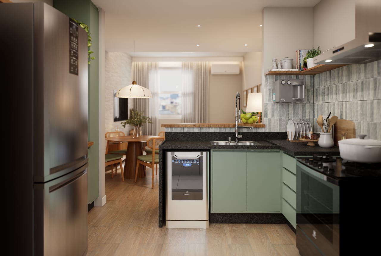 ✨ 2 quartos, sendo um deles suíte + banheiro social + banheiro de serviço + área de serviço