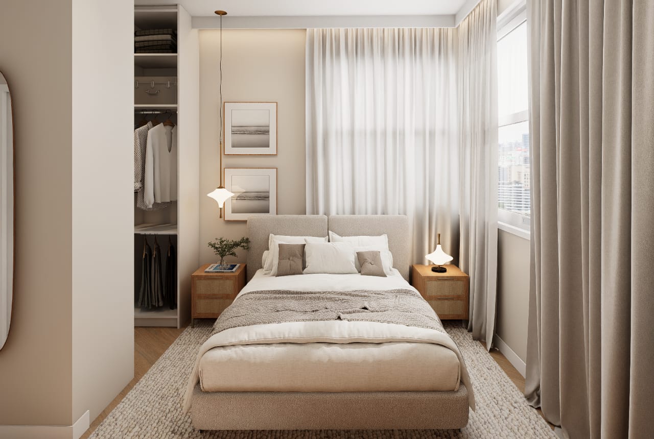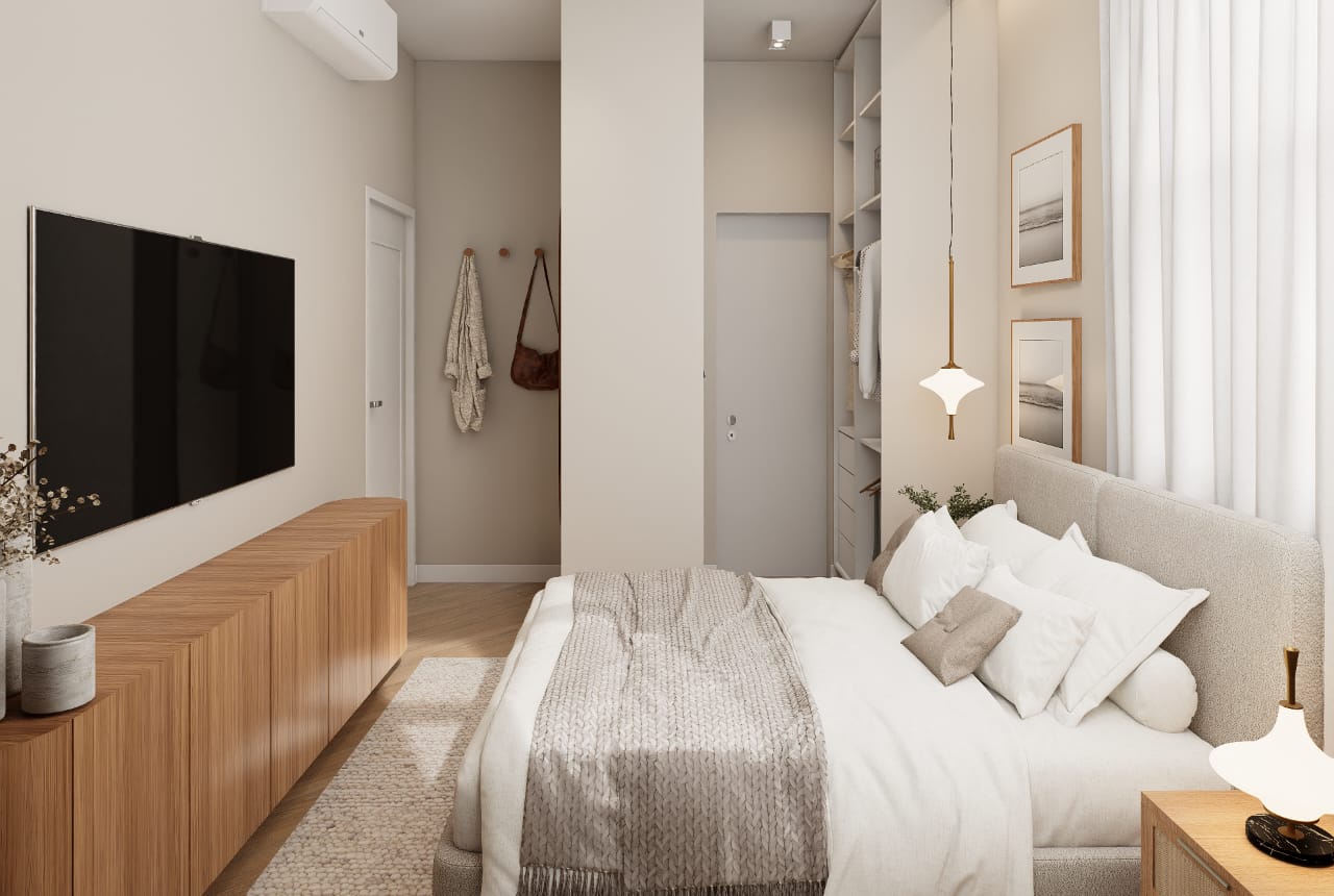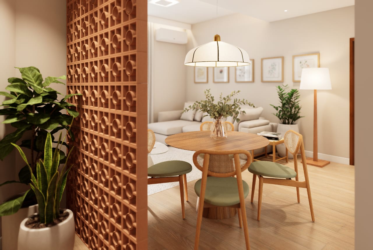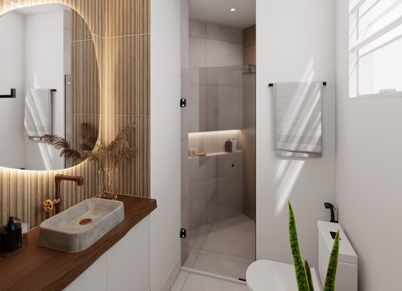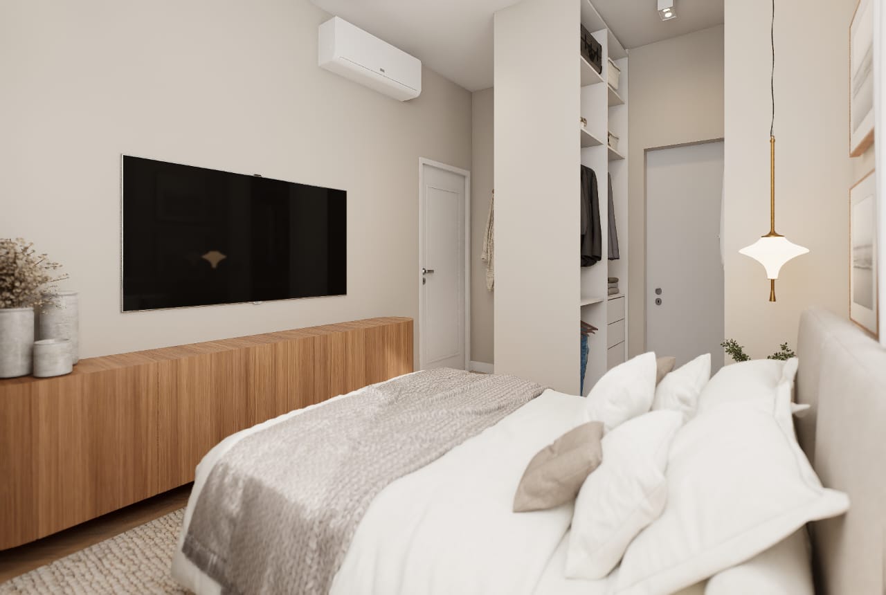 ✨ 2 quartos, sendo um deles suíte + banheiro social + banheiro de serviço + área de serviço